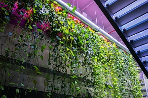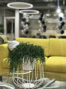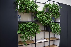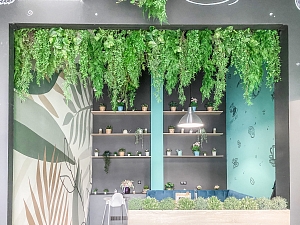 В проекте использовались высококачественные ботанические копии ампельных растений: Эпипремнум, Аспарагус, Нефролепис, Рипсалис. Наши специалисты разработали и смонтировали сетчатую конструкцию для крепления растений. Монтаж озеленения был осуществлён за 1 день.