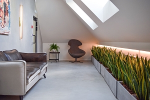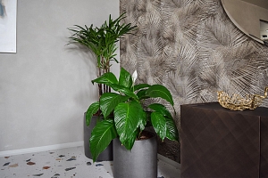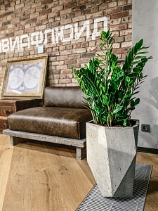 На входную группу добавили искусственные растения, в зоне отдыха акцентным растением стала крупная сочная Монстера, на стеллажах в переговорной разместили Сциндапсусы. Важным элементом также стали бетонные кашпо индивидуального производства. Благодаря материалу, геометрическим формам и оттенку, кашпо идеально подошли данному интерьеру.