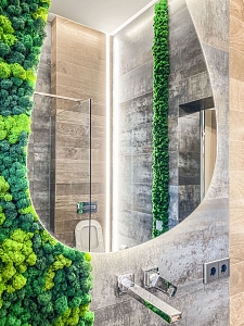 В данном проекте было осуществлено озеленение стабилизированным мхом санитарных узлов частного дома. Озеленено три санузла, в каждом из которых использовался высококачественный мох-ягель разных оттенков. Основным оттенком мха стал «зеленое яблоко», так как этот цвет эффектно и ярко смотрится в интерьере, где используются природные текстуры - камень, дерево. Также отличной задумкой было использование подсвечивающихся зеркал и боковых источников света. Благодаря этому мох выглядит еще более эффектным и выразительным. Результат работ полностью соответствует задумке и пожеланиям Заказчика.