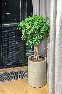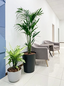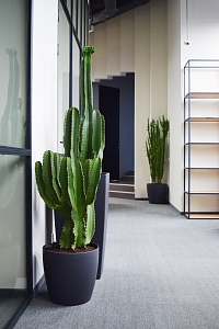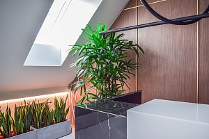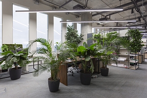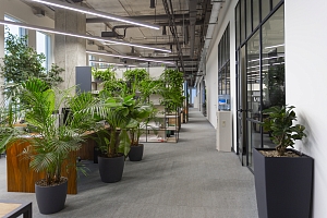 При создании данного проекта озеленения по просьбе Заказчика были подобраны, как классические офисные растения, так и экзотические: Бананы, Каламондины, Лимоны, Эуфорбии. Акцент был сделан именно на живую зелень разных фактур, поэтому кашпо были выбраны спокойных классических форм в цвете антрацит. Большое количество совершенно разных по фактуре и размерам растений позволило осуществить задуманное, и два этажа офисных пространств, в том числе большие зоны open space, ожили, создавая благоприятную атмосферу для работы. Растения стали неотъемлемой частью данного интерьера.