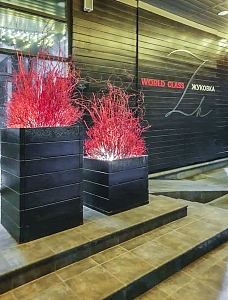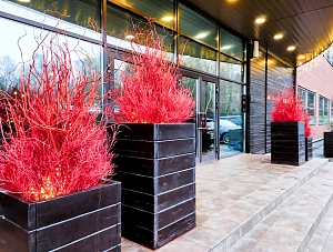 Клуб World Class Жуковка является особенным клубом всем известной фитнес сети. О своем статусе данный клуб заявляет ещё с порога, в этом не последнюю роль играет озеленение. Вдоль всего фасада располагаются контейнеры из древесины лиственницы с формованными разнофактурными кустарниками. На входной группе посетителей клуба встречают сезонные композиции. Весной, летом и осенью - это композиции из цветущих растений соответствующих сезону, а зимой - это яркие огненно-красные "костры" из декоративных веток, которые буквально завораживают. Всё это великолепие создаётся специалистами компании Listime и все растения находятся на нашем сервисном обслуживании.