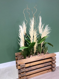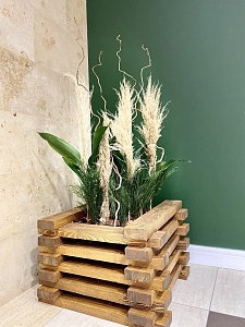 Нашими дизайнерами для деревянных кашпо Заказчика были разработаны индивидуальные композиции из нескольких составных частей: не требующие ухода стабилизированные растения, живые теневыносливые растения, декоративные ветви и сухоцветы.