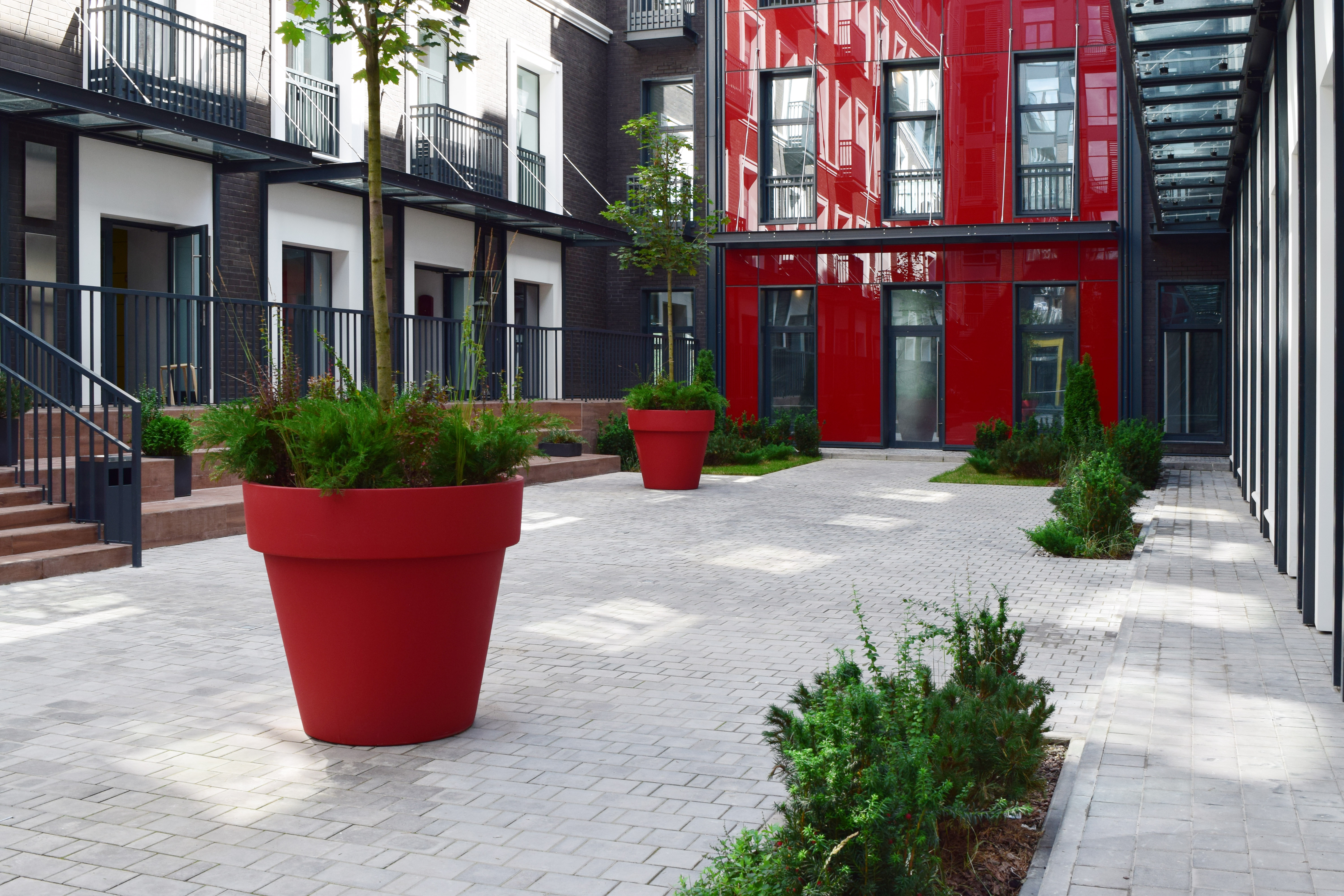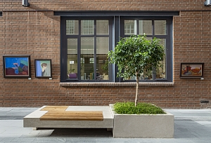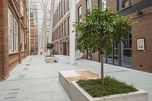 Когда мы заступили на объект, на его территории уже имелось некоторое озеленение. Но Заказчика оно не устраивало, хотелось больше растений и ощущения парка. Действовать пришлось в условиях очень ограниченной площади. В итоге, мы расширили площадь озеленения, добавив несколько дополнительных зеленых зон, высадили крупномерные деревья и кустарники, создали новые газонные покрытия, а в местах, где все равно не хватало зелени, разместили контейнеры с растениями, в том числе с однолетними цветами, которые компенсируют отсутствие клумб.