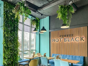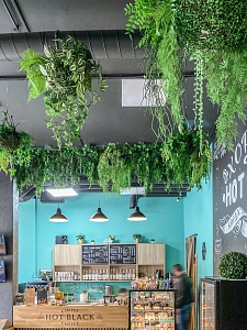 Согласование проекта происходило в максимально короткие сроки, а монтаж озеленения был осуществлен за 1 день. Интерьер кофейни буквально преобразился с появлением зелени. При этом потолочное и вертикальное озеленение позволили преобразовать интерьер не уменьшая пространство. Для небольших общественных зон, таких как рестораны и кафе, это идеальное решение.
