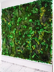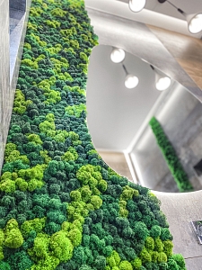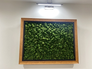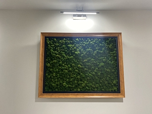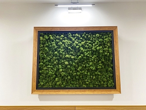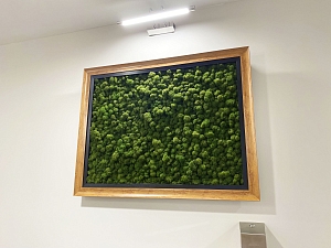 В рамках проекта дизайна коридоров офисного холла одной из московских компаний были предусмотрены панно из стабилизированного мха в количестве 12 шт. натурального цвета с использованием багета цвета Калифорнийский дуб. Наша компания учла пожелания заказчика по цвету и параметру рам, дизайнеры подобрали нужный оттенок мха-ягеля и багета. Заказчик остался полностью удовлетворён получившимся результатом.