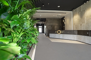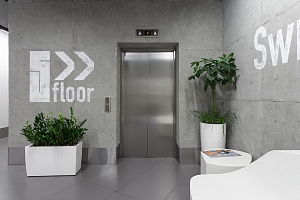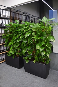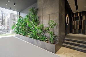 Целью данного проекта было оживить малоосвещённые входные группы, лифтовые холлы и коридоры бизнес центра. Именно поэтому фитодизайнеры остановили свой выбор на максимально стойких и неприхотливых растениях: Замиокулькасах, Сциндапсусах, Драценах. Кашпо были подобраны под стиль интерьера - классические в цвете черный глянец. Одним из важнейших элементом дизайна лобби стали полутораметровые изгороди из Сциндапсусов, зонирующие пространства.
