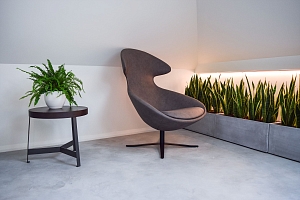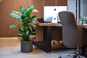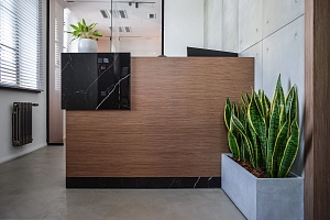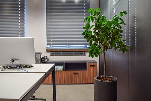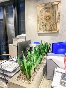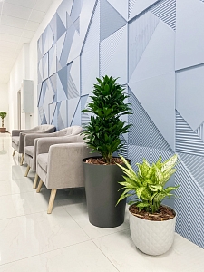 В данном проекте пожеланием Заказчика было "оживить" интерьер офиса, чтобы клиенты комфортно себя ощущали в помещении, а также отделить зону ожидания и озеленить всё рабочее пространство, при этом без трат на уход за растениями. Именно поэтому выбор был сделан в пользу искусственных растений премиум-качества, создающих ощущение живой зелени.