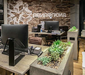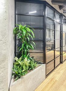 Современный офис компании в стиле лофт ожил, благодаря озеленению. Теперь под любым ракурсом сотрудники видят сочную зелень тропических растений. Миксы растений были подобраны таким образом, чтобы они хорошо сочетались и уживались между собой. Высадка производилась в массивные бетонные кашпо, которые являются дополнением интерьера и не перетягивают на себя внимания. Такая текстура кашпо очень выгодно подчеркивает зелень листьев, а декоративная галька, в качестве засыпки верхнего слоя, дополняет и завершает внешний вид композиций.