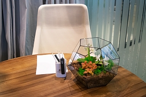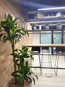 Основной задачей было зонирование пространства напольными и ампельными растениями и создание комфортной рабочей среды для посетителей коворкинга. Композиции на стеллажах и напольные композиции в переговорных комнатах, все это делает пространство завершенным и оптимальным для работы. Бюджет данного проекта был ограничен, но нашим специалистам удалось наполнить помещения зеленью, не смотря на строгие финансовые рамки.