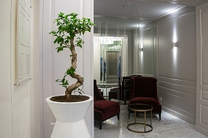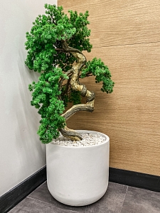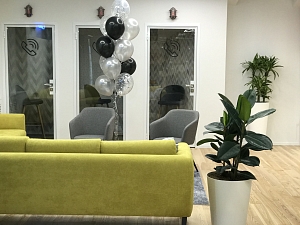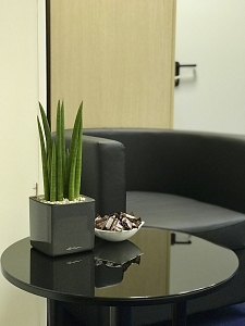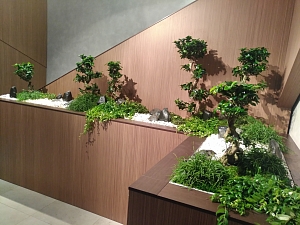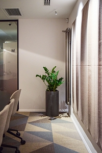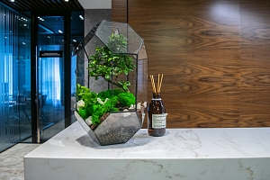 С помощью искусственного Бамбука мы создали "зелёные" перегородки в зоне ожидания, также Бамбук разместили вдоль панорамных окон офиса, создав интересный эффект присутствия зелени. Для озеленения офисного пространства использовались ботанические копии Замиокулькасов, а также локально расставленные акцентные искусственные растения в современных кашпо – Бонсаи и Фикусы.