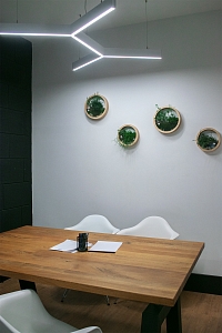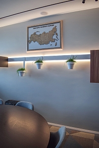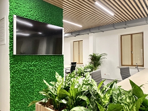 В офисе компании Россети нашей компанией были оформлены стены в зонах open-space и переговорных с помощью панно из стабилизированного мха-ягеля. Фитомодули прибыли на объект полностью готовыми, монтаж занял всего несколько часов, после чего помещение кардинально изменилось. Мох идеально вписался в офисный интерьер, освежил его, сделал более живым и интересным.