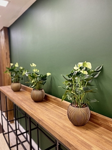 В таких местах, где мало солнечного света, отлично себя чувствуют Аспидистры, которые отличаются своей неприхотливостью. Декоративные ветви прекрасно дополнили декор помещения из натурального дерева. Также на стойке в столовой зоне разместились Антуриумы в круглых кашпо, дополняя общий вид своей изящностью.