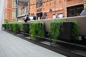В данном проекте перед нами стояла задача эргономично озеленить и разграничить пространство, называемое Touchdown Area. В этой зоне посетители коворкинга могут сменить обстановку, выпить кофе, перевести дух и просто отдохнуть. Деревянные модули с растениями стали прекрасным решением этой задачи. Наши специалисты подобрали такие растения для композиций, которые не только визуально хорошо сочетаются между собой, но и сосуществуют в тандеме с точки зрения биологии.